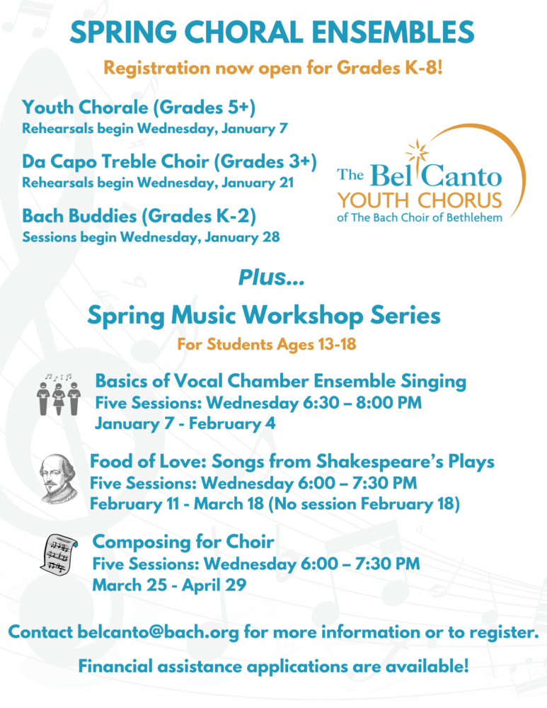 The Bel Canto Youth Chorus of The Bach Choir of Bethlehem provides opportunities for excellence in choral education and performance where all are welcome. Musicianship, leadership, and community are cornerstones of our ensemble. The Bel Canto Youth Chorus currently offers three choirs, each dedicated to musical excellence, with instruction appropriate to singers’ vocal development: Da Capo Treble Choir, Youth Chorale, and Concert Choir.