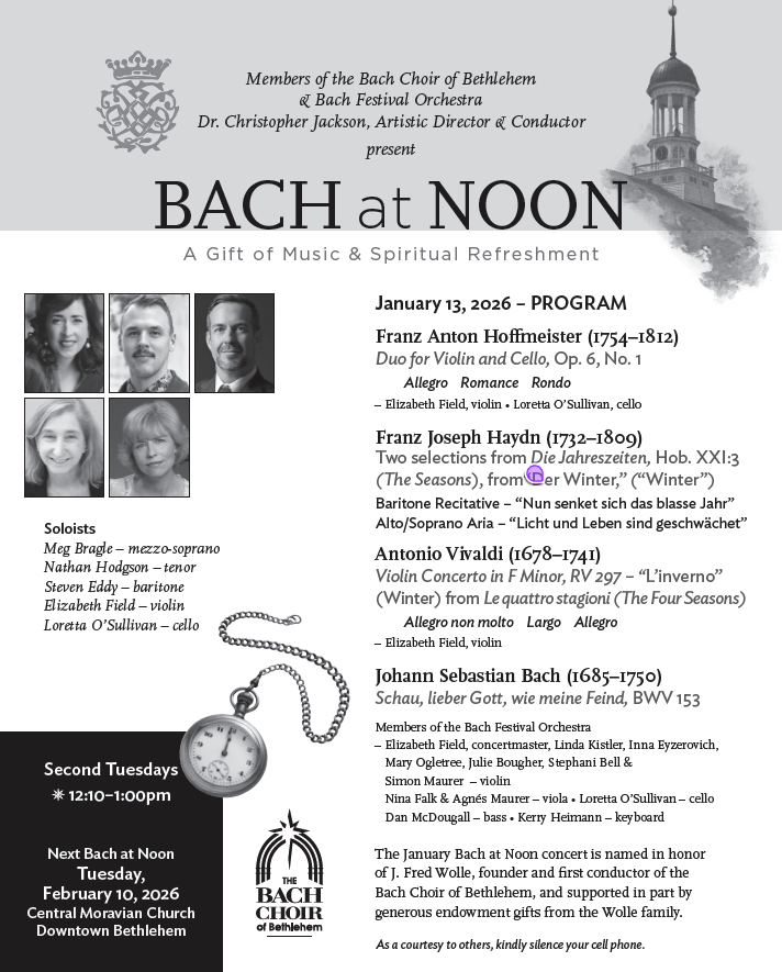 Hear members of the Bach Choir and Bach Festival Orchestra along with exciting guest artists. Enjoy insightful and enlightening remarks by Christopher Jackson, Artistic Director and Conductor of the Bach Choir. The January Bach at Noon concert is named in honor of J. Fred Wolle, founder and first conductor of the Bach Choir of Bethlehem, and supported in part by generous endowment gifts from the Wolle family.