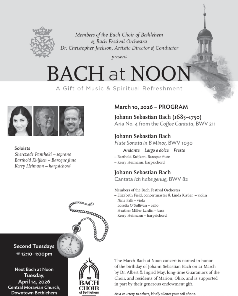 Our season continues with our inspiring Bach at Noon series in Bethlehem. Gather with us for this free concert series, a musical gift to our community. Hear members of the Bach Choir and Bach Festival Orchestra along with exciting guest artists. Gather with us for this free, inspiring concert series, a musical gift to our community.