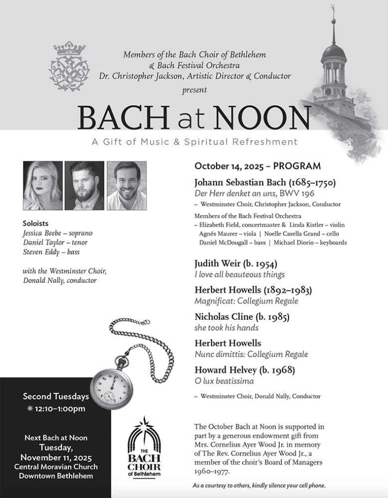 Our season continues with our inspiring Bach at Noon series in Bethlehem. Gather with us for this free concert series, a musical gift to our community. Hear members of the Bach Choir and Bach Festival Orchestra along with exciting guest artists. Gather with us for this free, inspiring concert series, a musical gift to our community. Hear members of the Bach Choir and Bach Festival Orchestra along with exciting guest artists. Enjoy insightful and enlightening remarks by Christopher Jackson, Artistic Director and Conductor of the Bach Choir. The October Bach at Noon is supported in part by a generous endowment gift from Mrs. Cornelius Ayer Wood Jr. in memory of The Rev. Cornelius Ayer Wood Jr., a member of the choir’s Board of Managers 1960-1977.